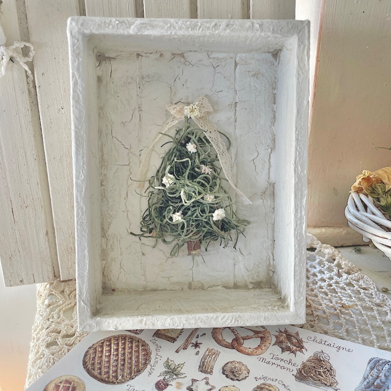 【現品・在庫あり】フレンチ雑貨 ちいさな木箱とクリスマスツリーセット 北海道ハーブ ドライフラワー 壁掛け アンティークレース付き